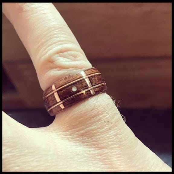 This ring is handcrafted from Brazilian Rosewood and Cherry wood in the bentwood fashion for strength and durability. The ring features Mother of Pearl fret dots and copper frets with two guitar strings. A truly beautiful conversation piece for any guitarist.
